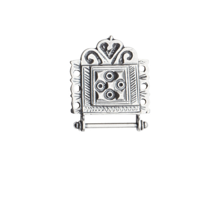 Beltestøl med ringlauv i oksidert sølv. Den er spesielt laget til rekonstruert romsdalsbunad,  og er utformet etter gamle funn.
