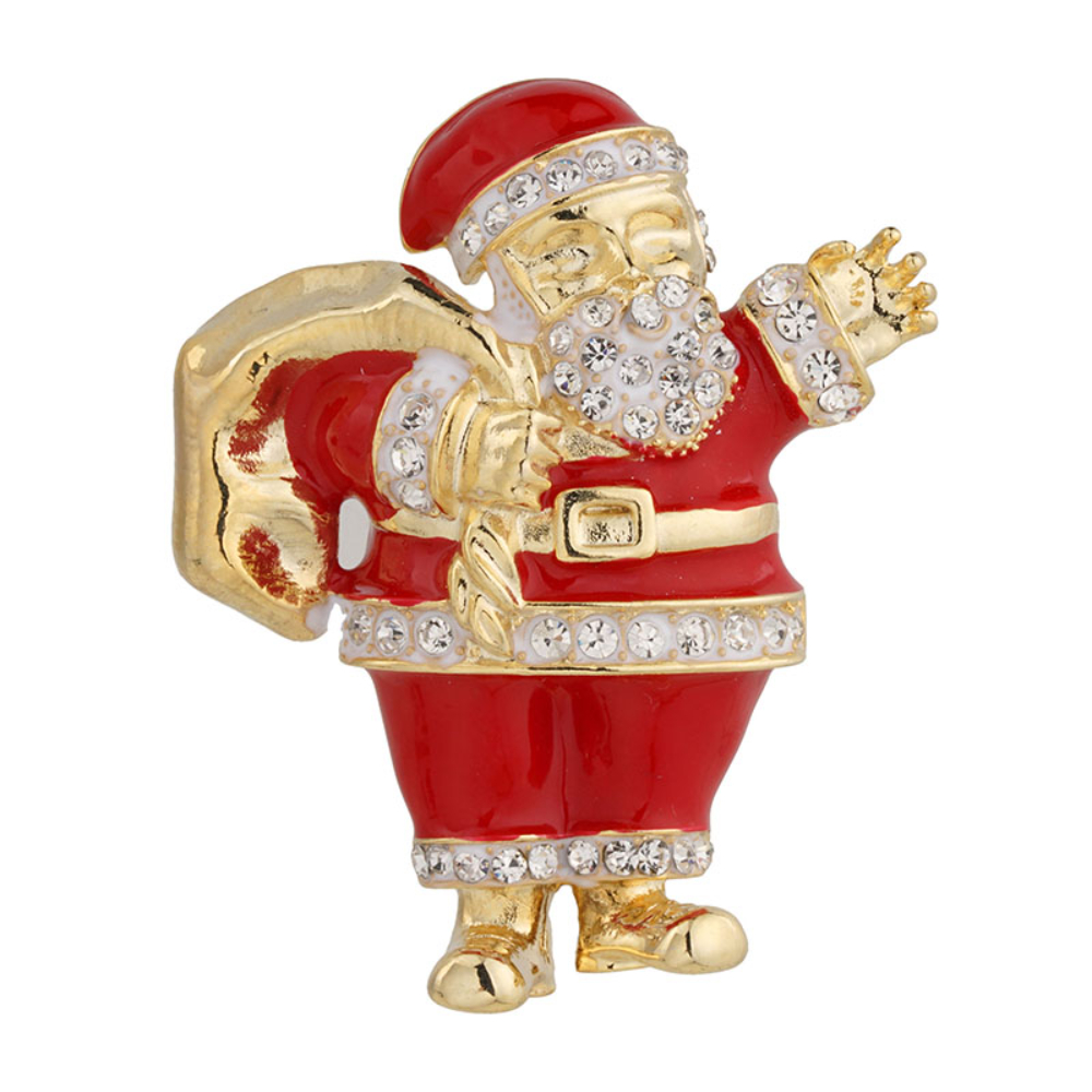 Brosjen er dekorert i klassisk rødt og gull, med glitrende klare stener som gir ekstra feststemning. Den detaljerte utformingen viser julenissen med sin sekk over skulderen og et vennlig vink – perfekt for å spre litt ekstra julemagi.