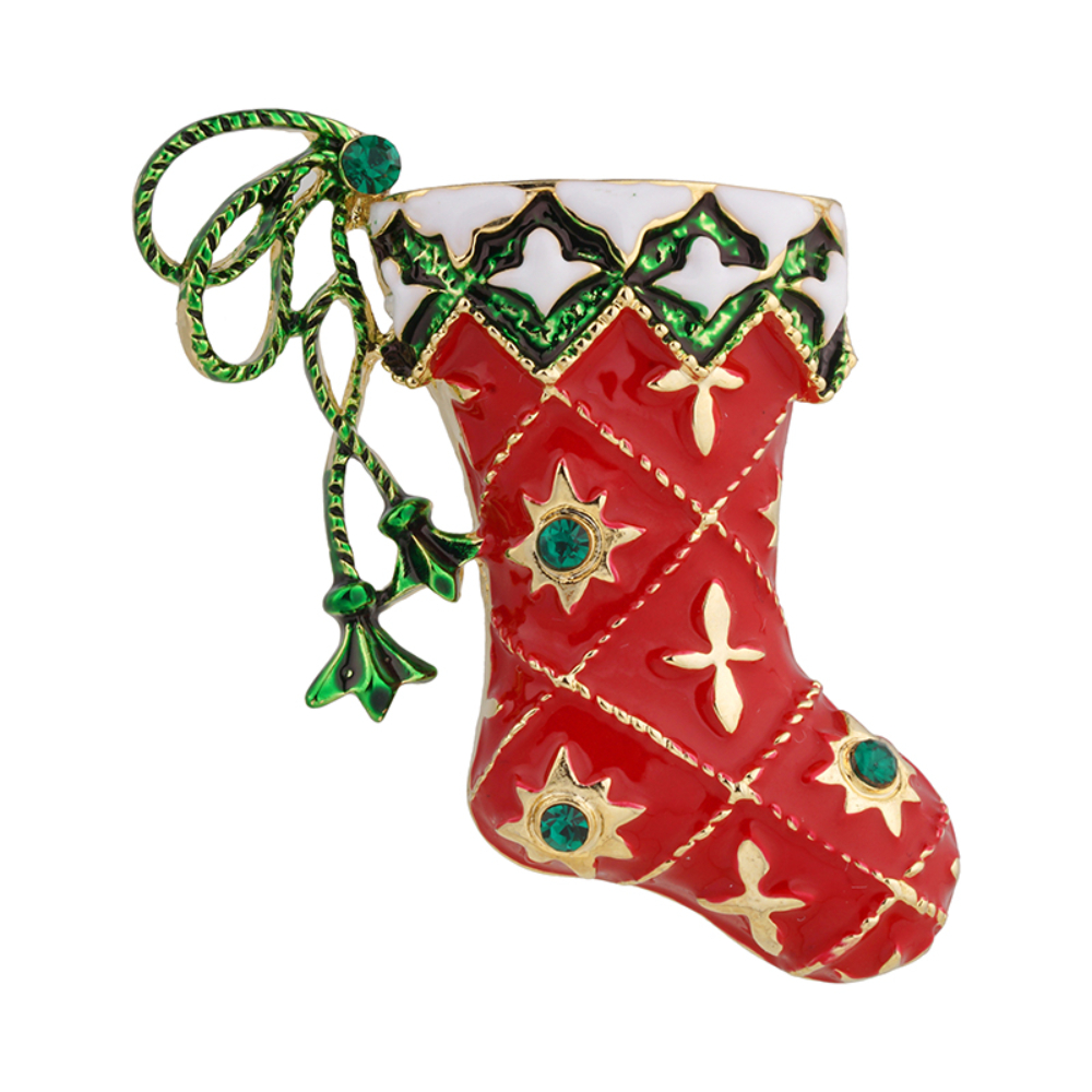 Brosjen er dekorert i klassisk rødt, gull og grønn med glitrende klare stener som gir ekstra feststemning. Den detaljerte utformingen viser en julestrømpe – perfekt for å spre litt ekstra julemagi.