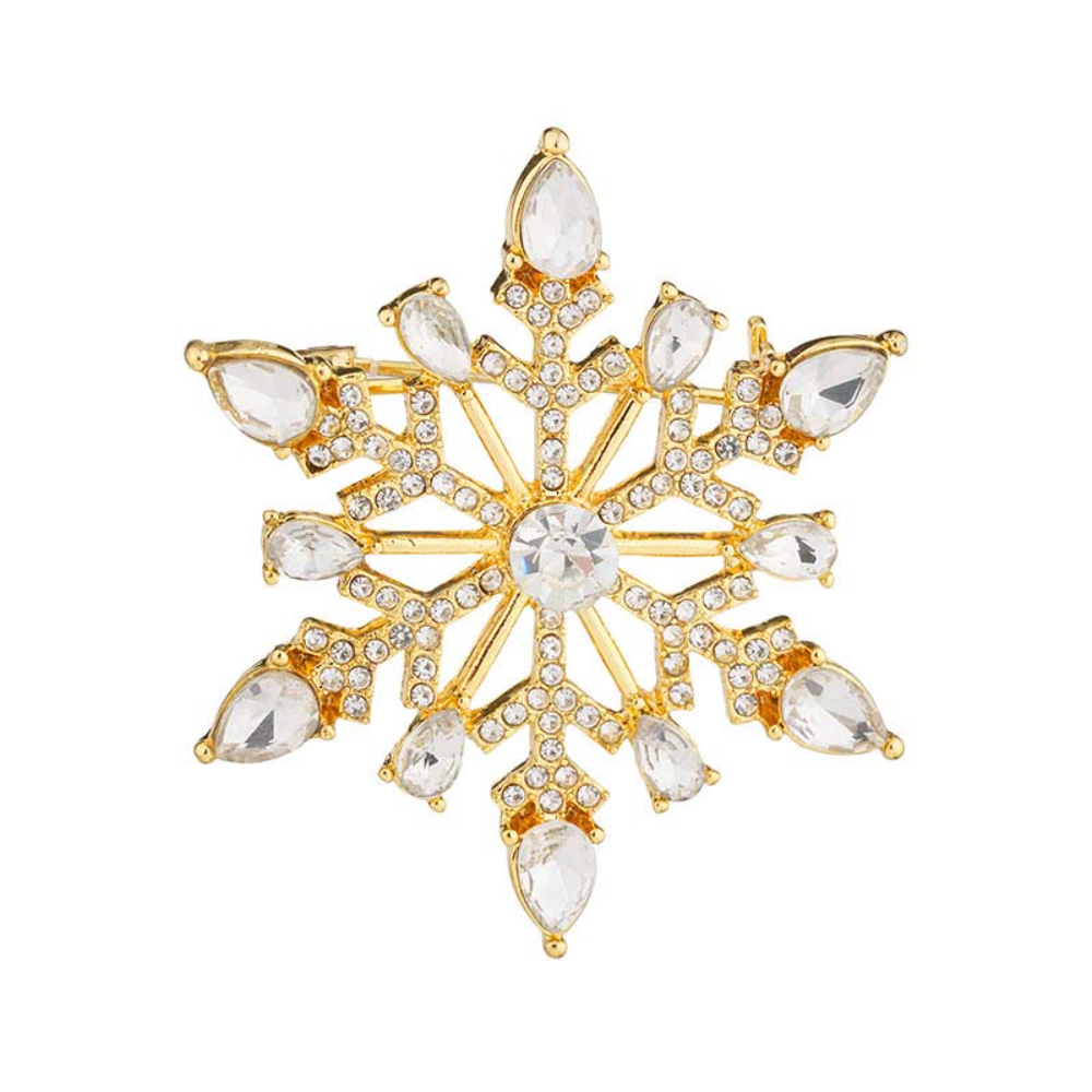 Brosjen er dekorert med glitrende klare stener som gir ekstra feststemning. Den detaljerte utformingen viser en snøstjerne i sin prakt – perfekt for å spre litt ekstra julemagi.