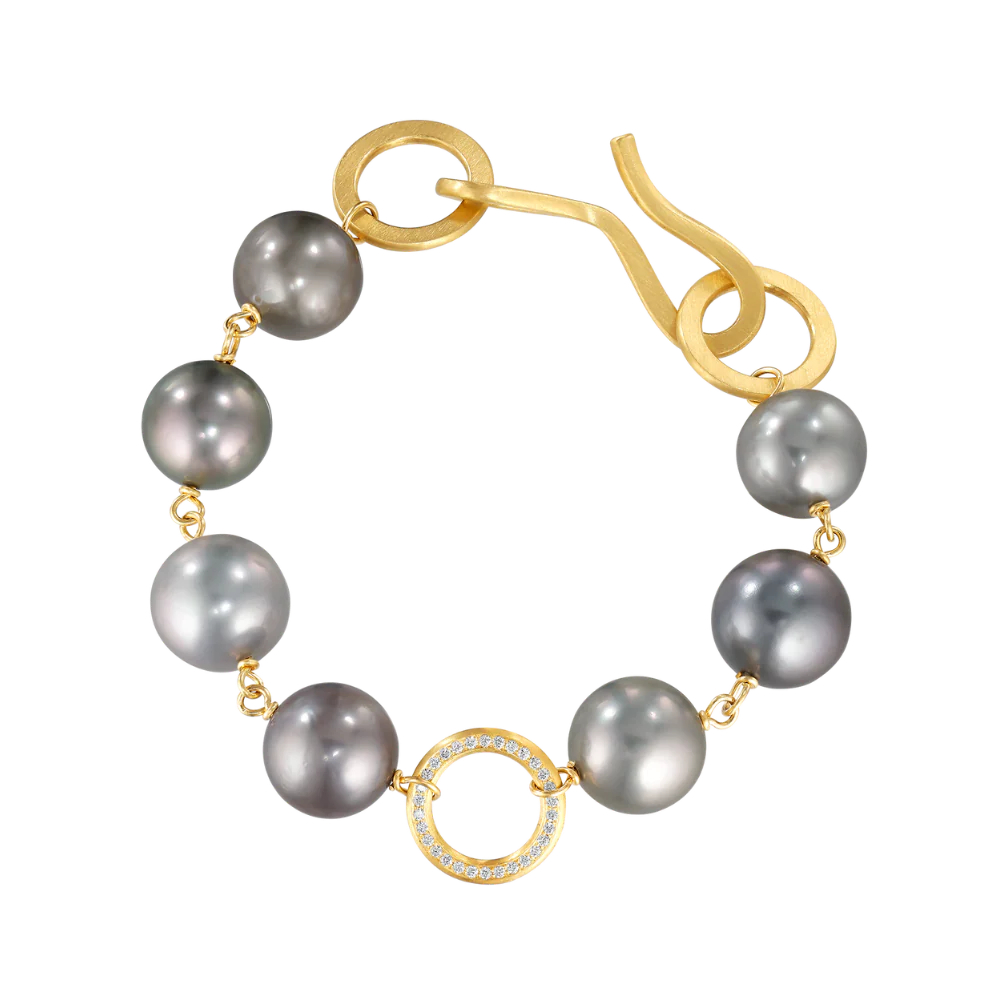 Anello armbåndet er en markant komposition av store, mørke Tahiti-perler, viklet på en tråd av 18k gult gull. 60 brilliantslipte diamanter, i alt 0,34 ct., F/G, VS2, Ex. Cut., er nedstukket på begge sider av gullringen i midten av armbåndet, med en silkemyk, matt overflate.