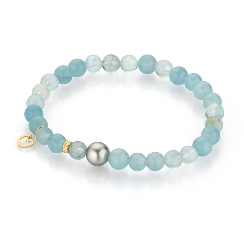 Armbånd fra Gellners Bing Bang-kolleksjon med akvamariner, samt 1 stk. semi-rund Tahitiperle på 8-9 mm.