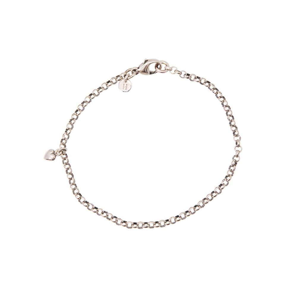 Elise armbånd 1 rad er et enkelt armbånd som kan brukes til det meste. Denne oksiderte versjonen har et blankt sølvhjerte tilsynelatende tilfeldig plassert.