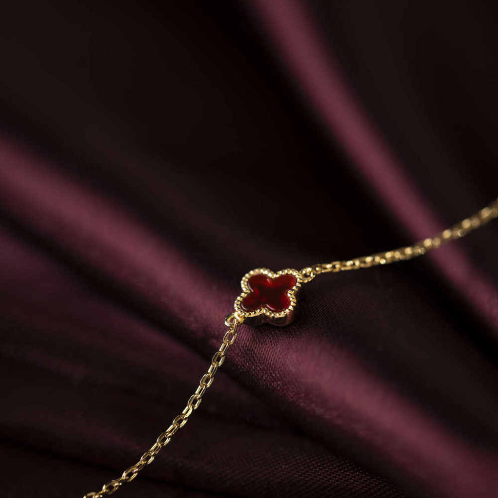 Pan Jewelry Trend – Armbånd i forgylt sølv med dyp rød kløver