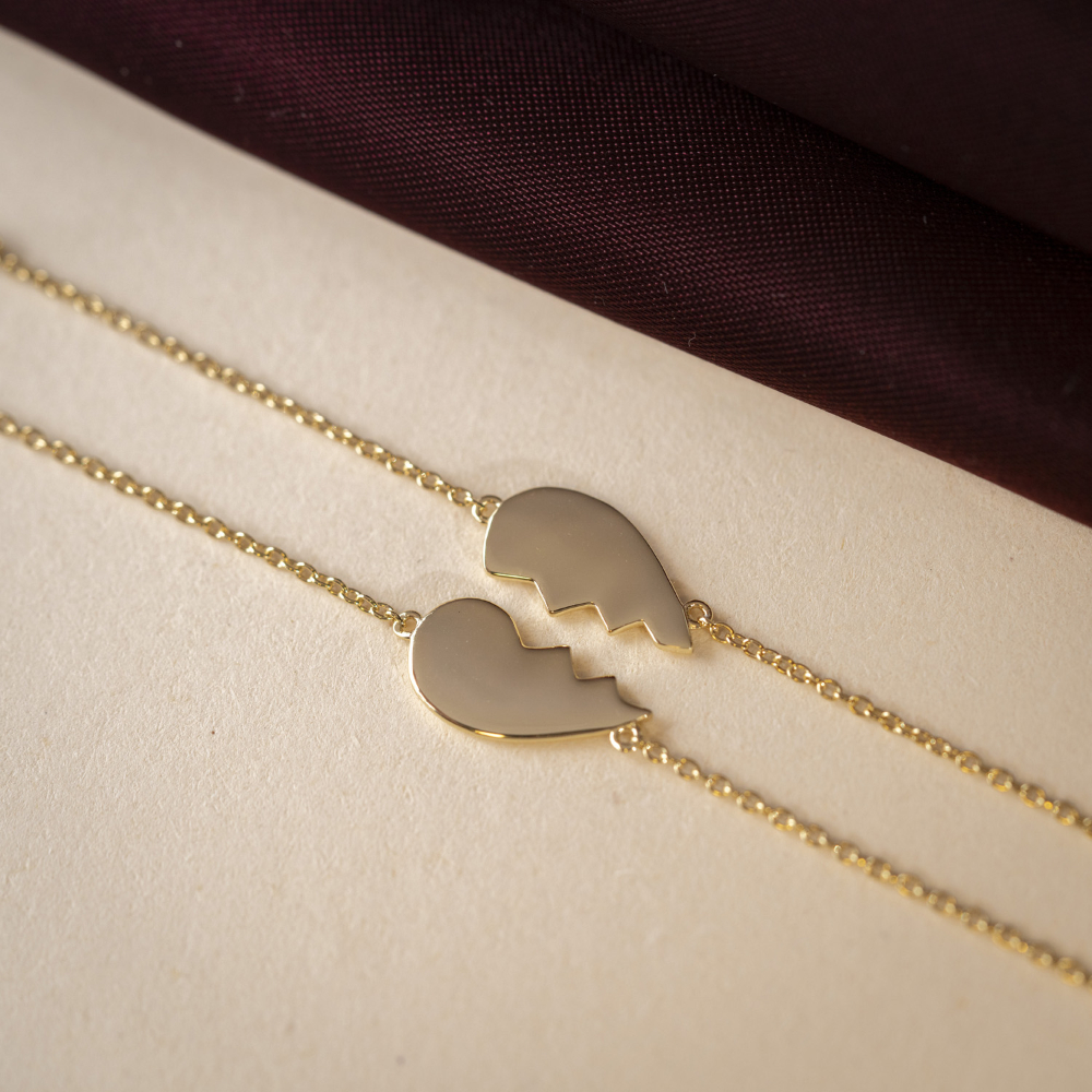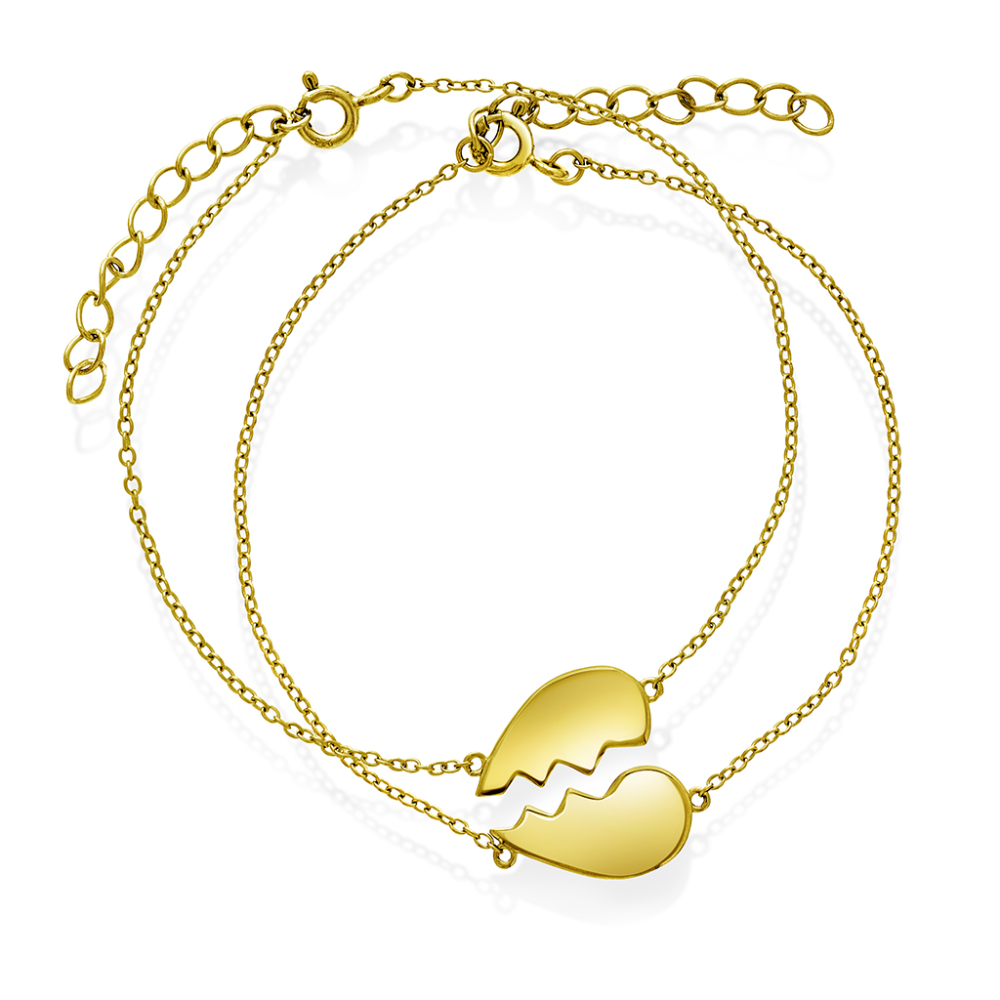 Vennskapsarmbånd – to halvdeler, ett hjerte. To vakre armbånd i 925 sterling sølv belagt med 14k gult gull og med et delt hjerte – én halvdel til deg, én til din beste venn.