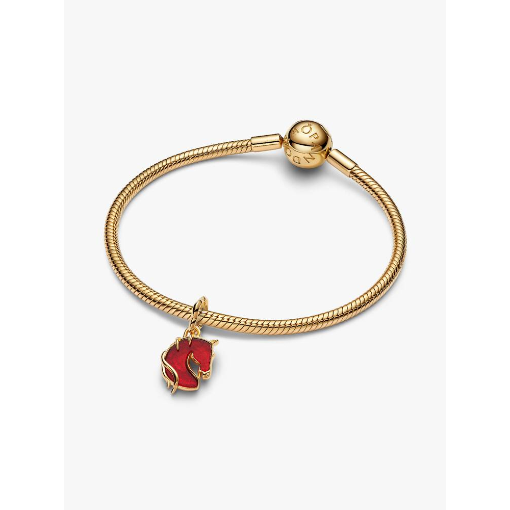 Slipp kreftene fri. Denne hengende charmen er belagt med 14k gull og er formet som en hest i rødt Muranoglass med gullfolier og skyinspirerte detaljer. En perfekt hyllest til hestens år – et år fylt av styrke og vitalitet.