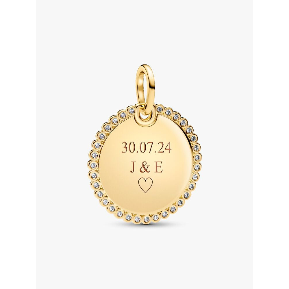 Oppdater smykkesamlingen din med vårt 14k gullbelagte inngraverbare skiveanheng, omgitt av en sirkel av funklende steiner.