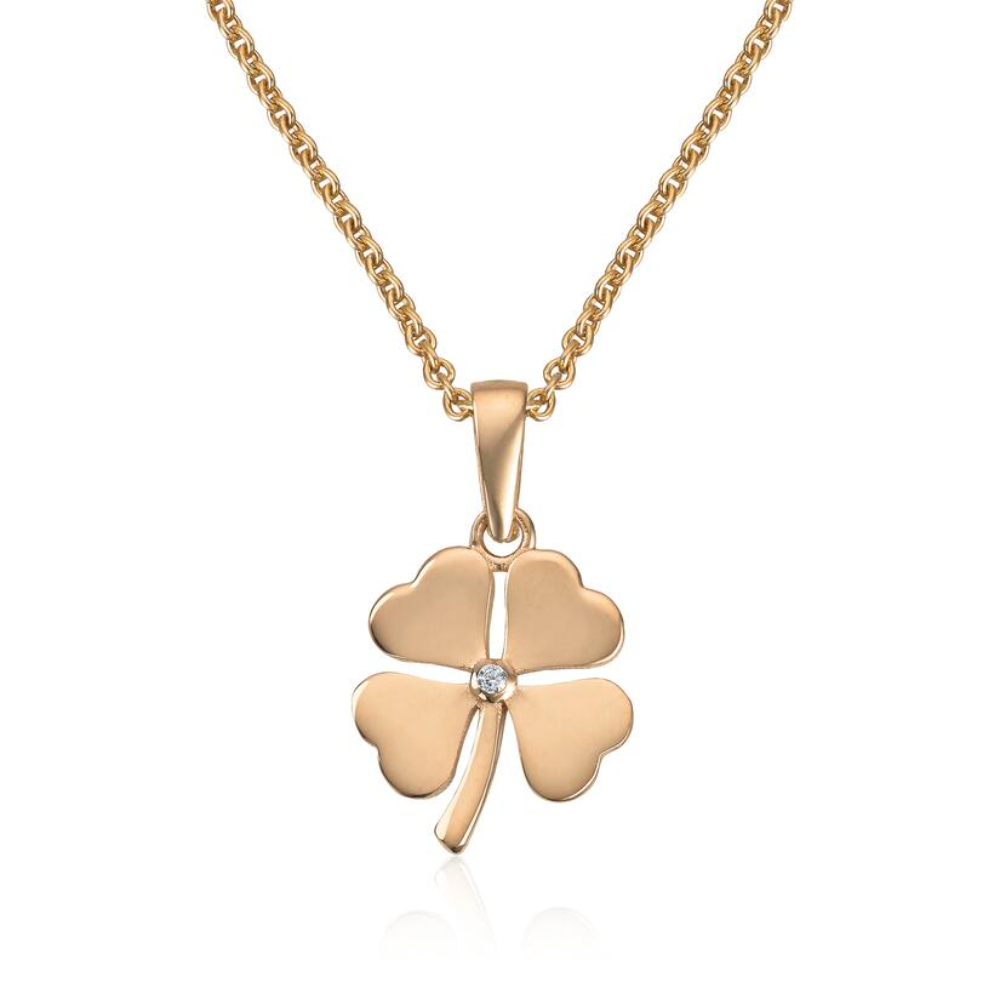 Espeland- Anheng i gult gull 585 med firkløver og Zirkonsten. NB: uten kjede.