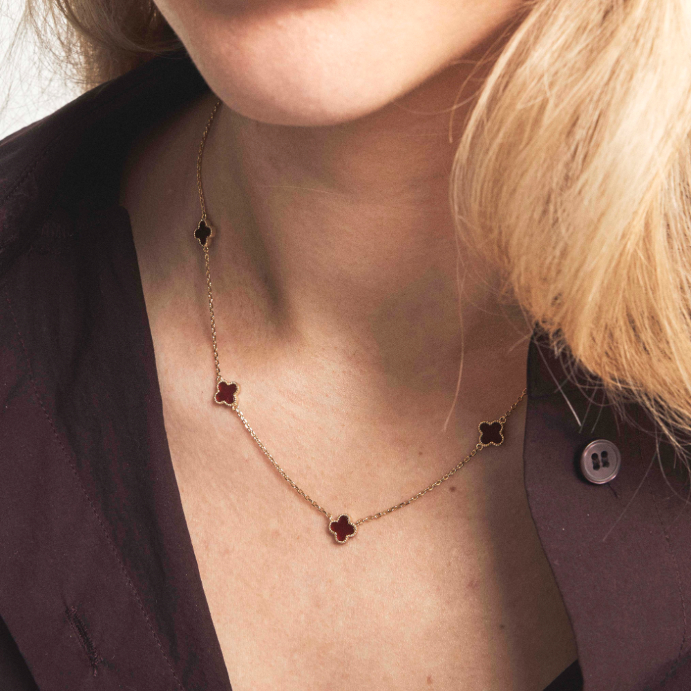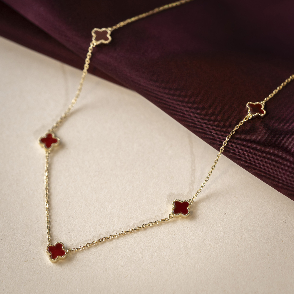 Lekkert halssmykke i 925 sterling sølv belagt med 14k gult gull, her med kløver i rød agat.