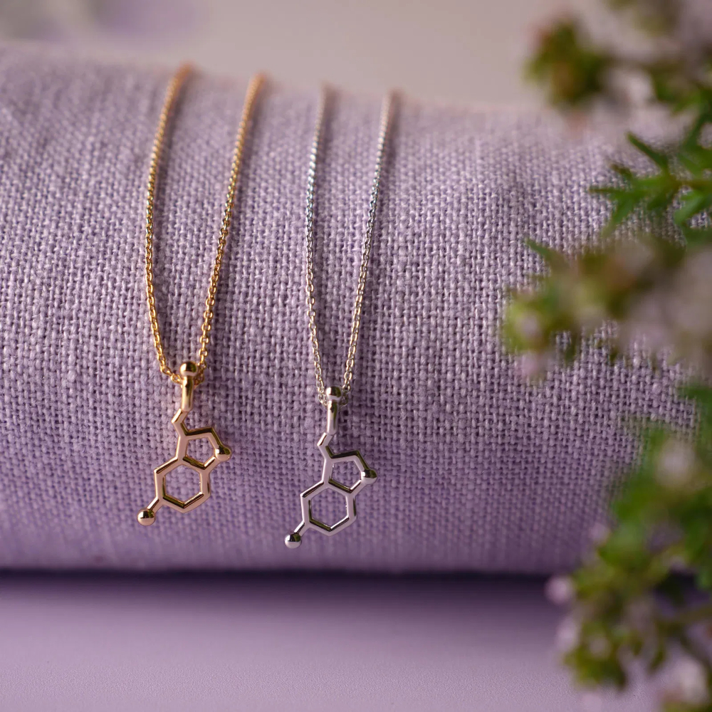 Halssmykke i forgylt sølv med molekylet serotonin, som regulerer nivå av velvære og balanse.