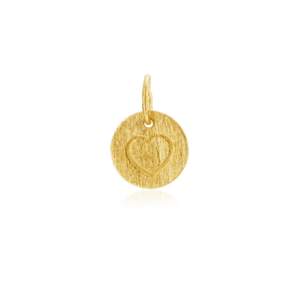 Et rundt anheng i 925 sterling sølv belagt med 14k gult gull og med et inngravert hjerte.