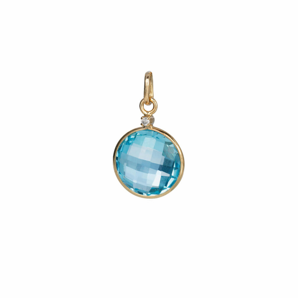 Et vakkert og rundt anheng i 14k gult gull med fasettert blå topas og med en diamant.
