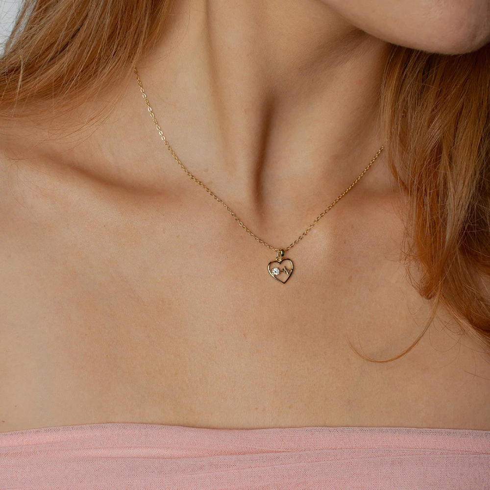 Hjertebank smykke i forgylt sølv med zirkonia og hjerteriss, som viser hjerterytmen – et sterkt symbol på liv, kjærlighet og de øyeblikkene som gjør at hjerte slår et ekstra slag. E personlig uttrykk til deg selv, og som en gave til noen du er glad i.