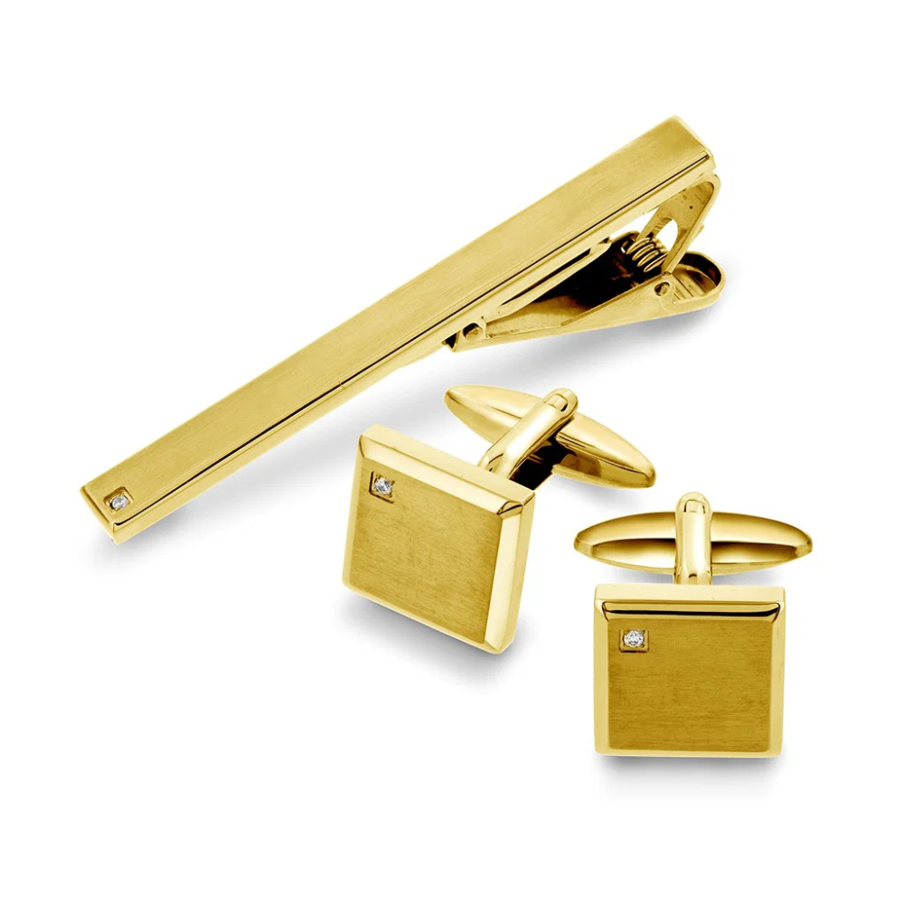 Klassiske firkantede mansjettknapper og slipsnål i gullfarget med en enkel zirkonia.