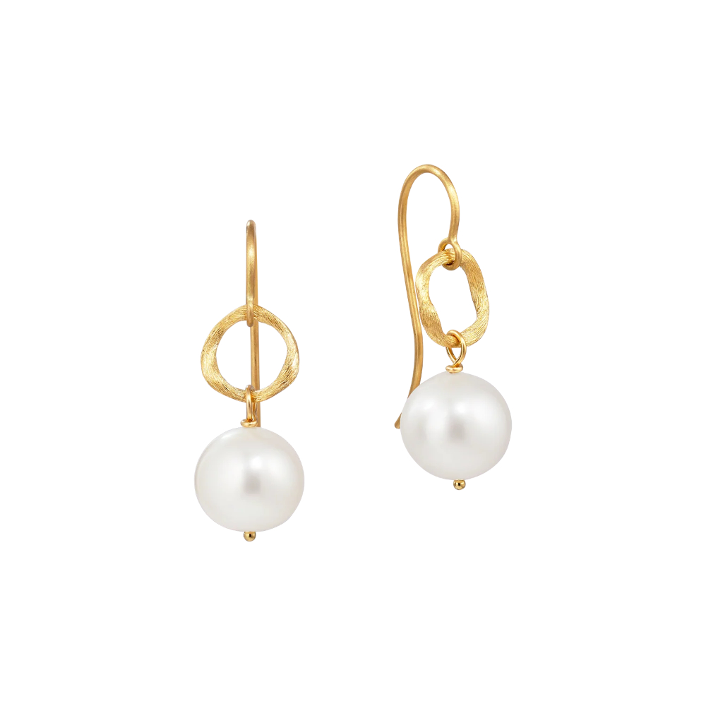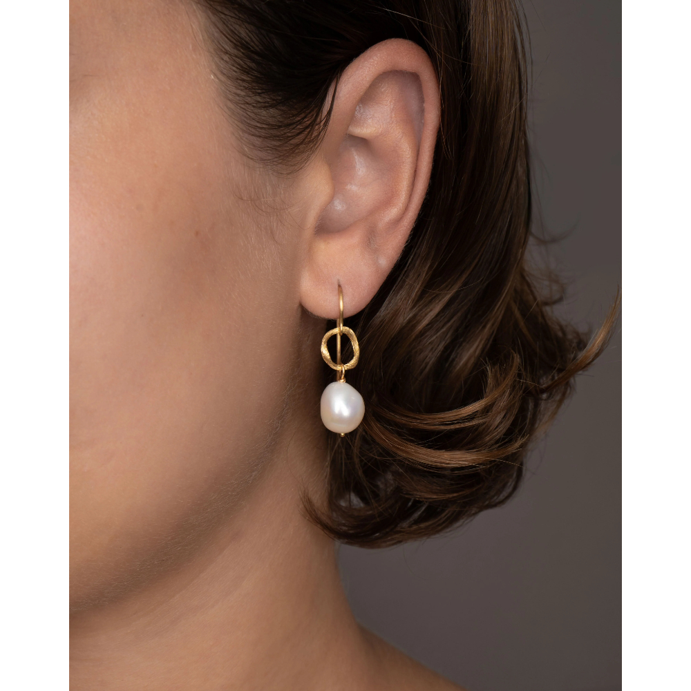 Vega Loop-øredobbene i 18 k gult gull kombinerer Dulongs signaturbørstede finish med klarheten til ferskvannsperler. De gylne ringene og bevegelsen til de runde perlene skaper et lysende og mykt uttrykk.