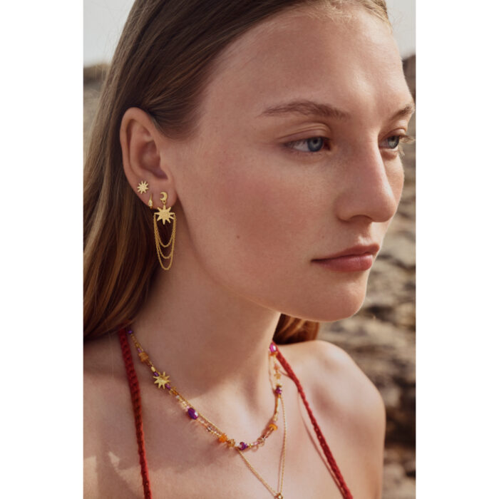 Den flytende og fint balanserte symbiosen mellom dag og natt gjenspeiles i Maanesten sine Emerie Earrings, der månen følges av solen med et ekko av gylne kjeder.