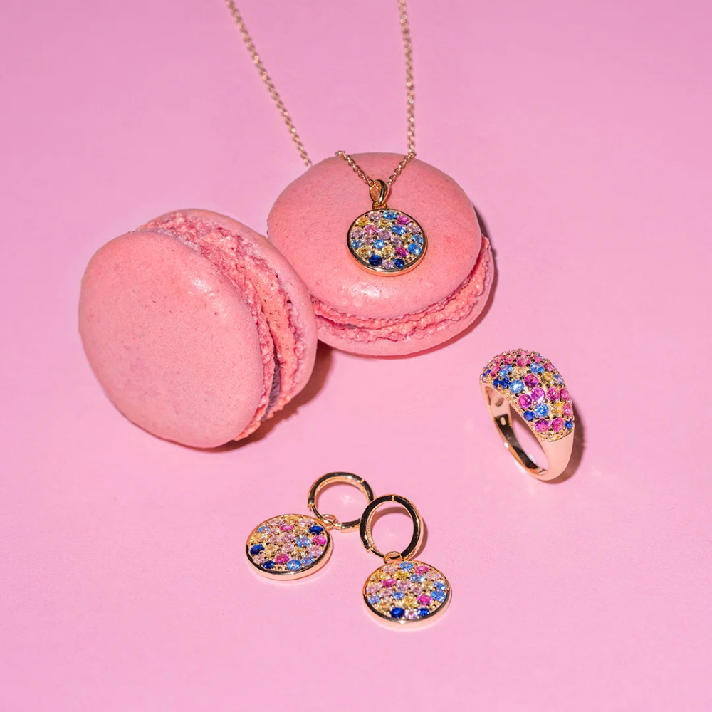 Shine øreringer i forgylt sølv med en dekorativ plate besatt med glitrende zirkonia i flere farger. Festklare øredobber som fanger lyset og gir antrekket et glamorøst løft. Kommer også i smykke og ring, samt i flere farger.