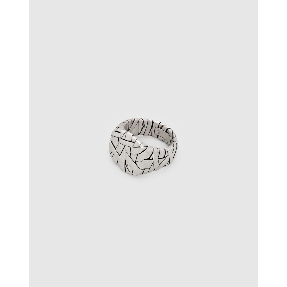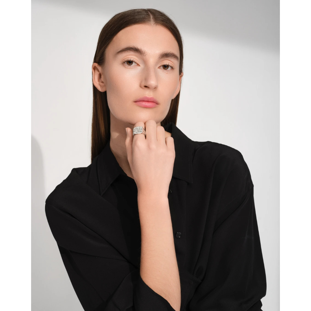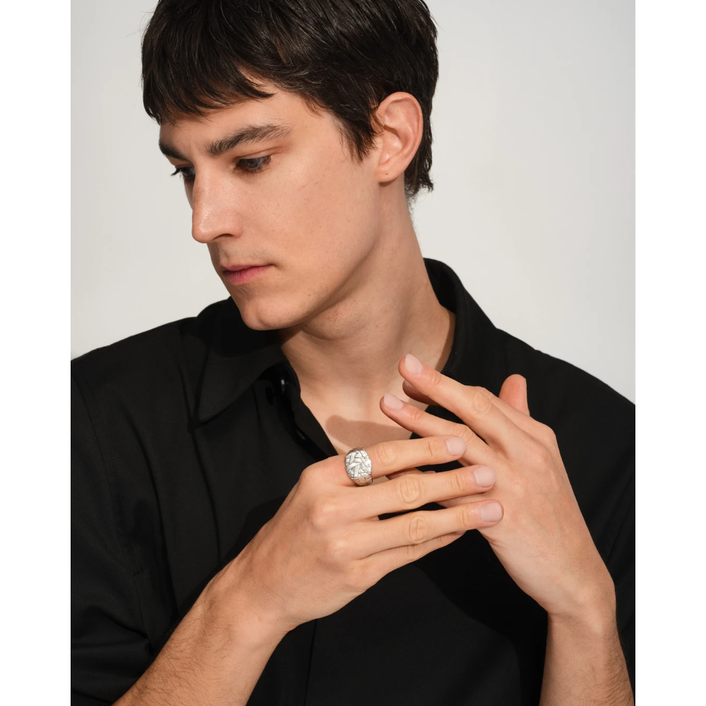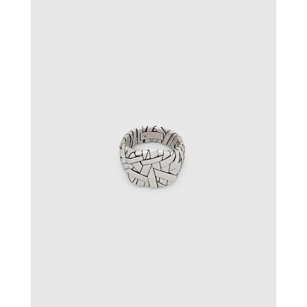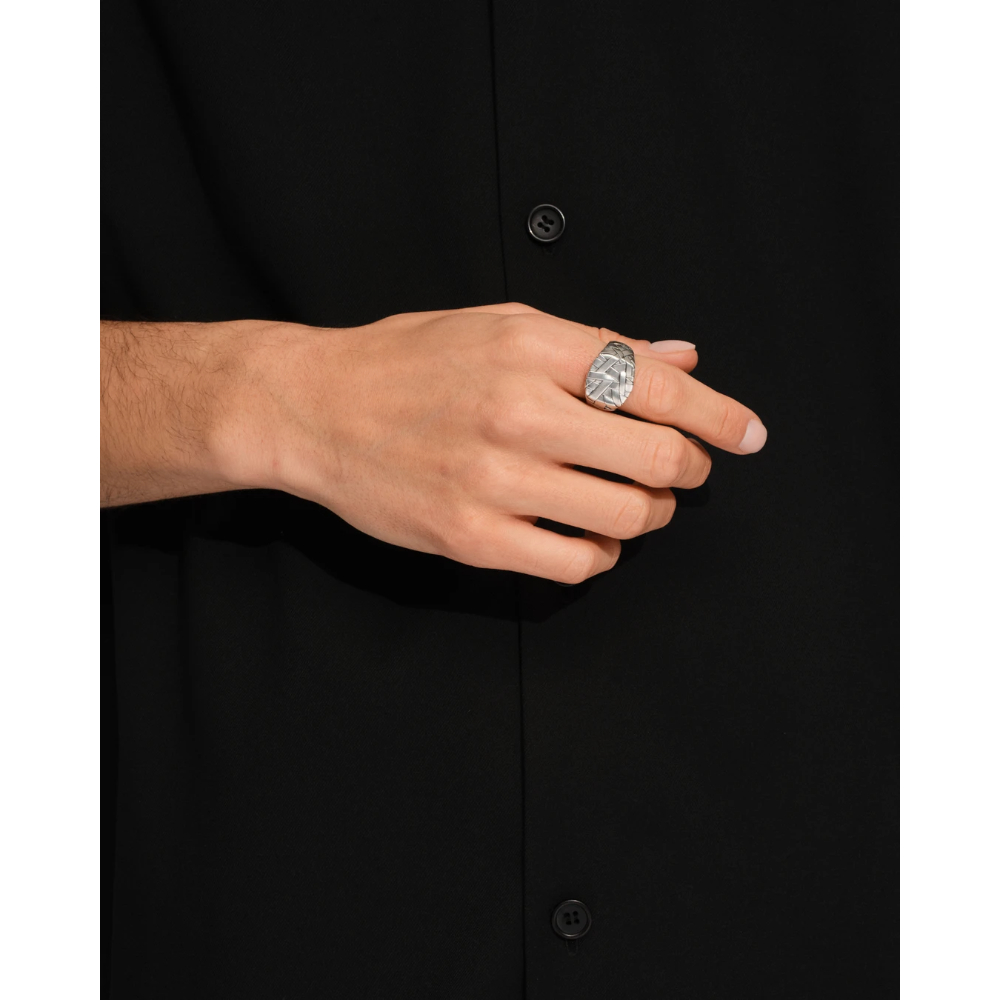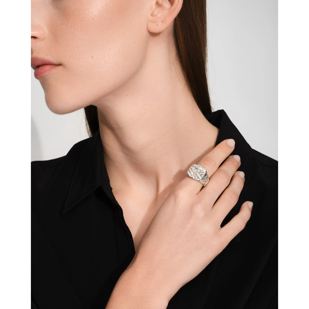 Quiltringen er en innovativ vri pĂ¥ den klassiske cushion-ringen, med en vevd overflate i satengfinish som gir dybde og et teksturert utseende. Laget gjennom en blanding av hĂ¥ndverk og moderne teknologi.